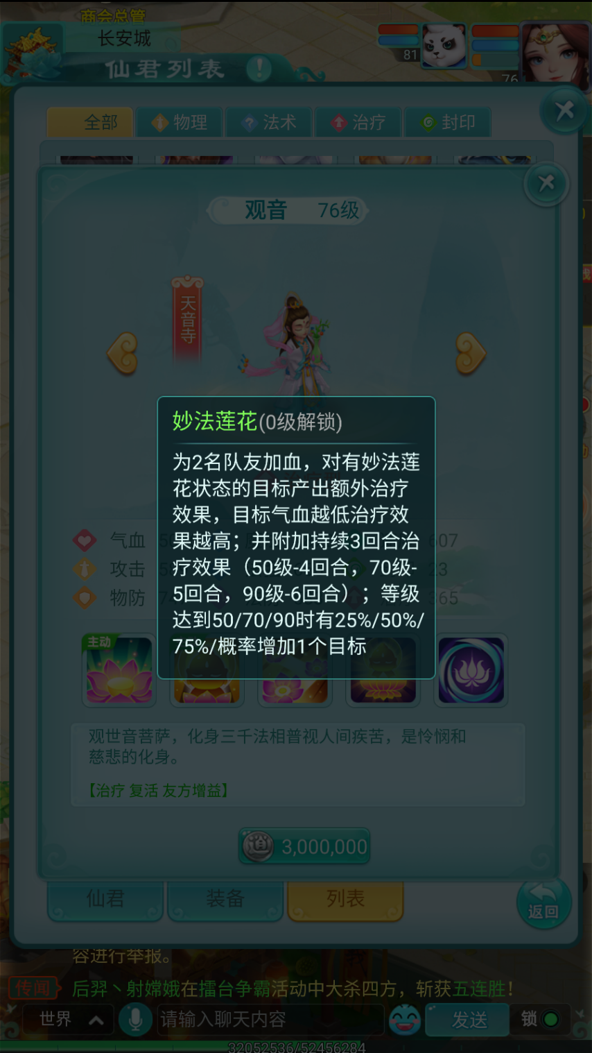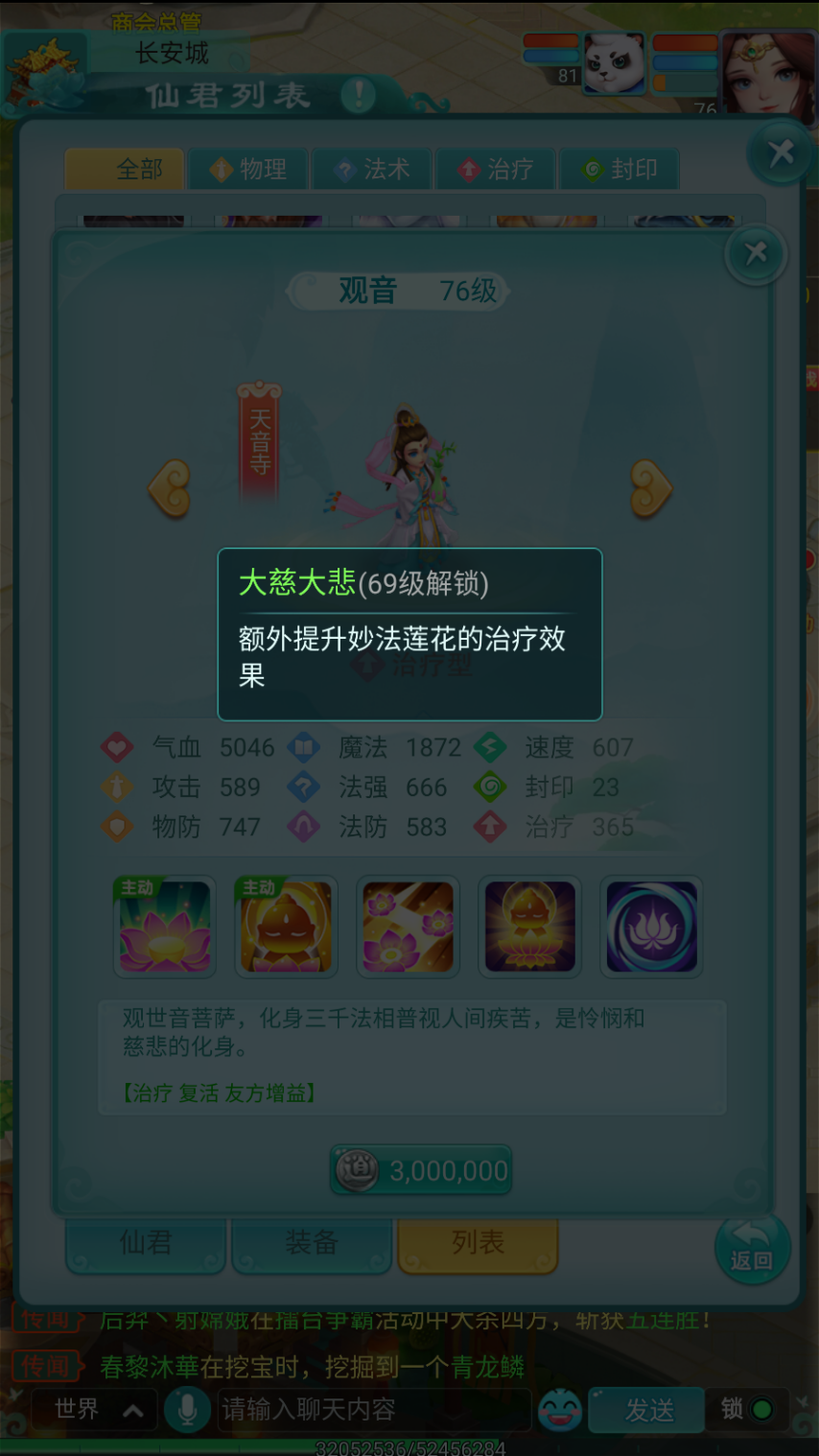 在仙君体系里,观音隶属于天音寺这一专攻治疗的门派。她自身不仅有着出色的生存本领,还拥有强劲的团队治疗与复活技能,称得上是最专业的“奶妈”。只要队伍中有她在,整体的生存能力便能实现根本性的提升。
