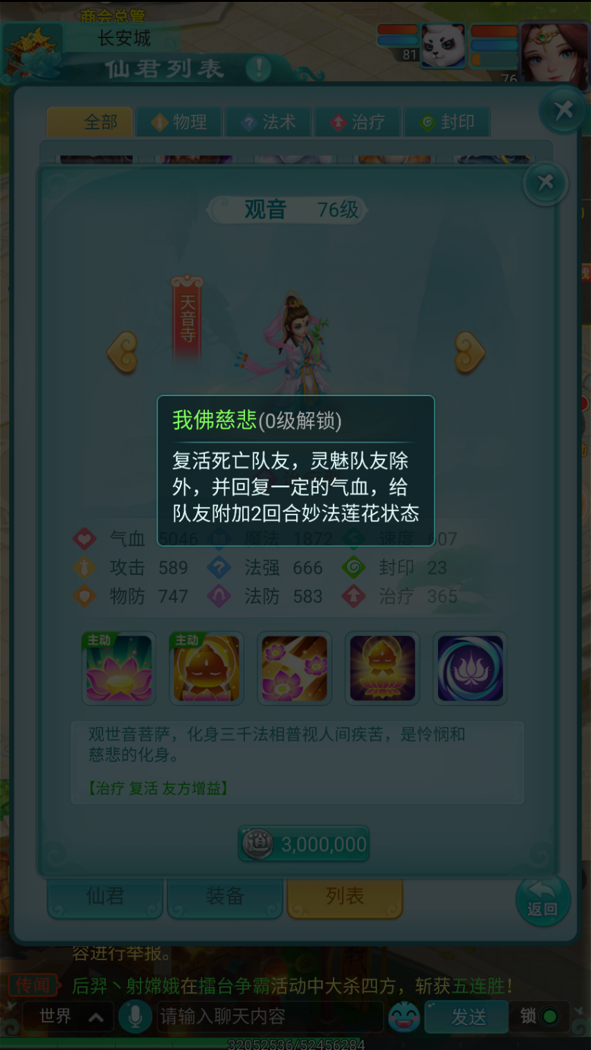 “我佛慈悲”是观音的核心复活技能,少侠在初始阶段就能用。这个技能不仅能马上复活一位倒下的队友,还会恢复其部分气血,同时附加持续两回合的“妙法莲花”状态,让目标每回合自动回复生命值,达成持续恢复的效果。