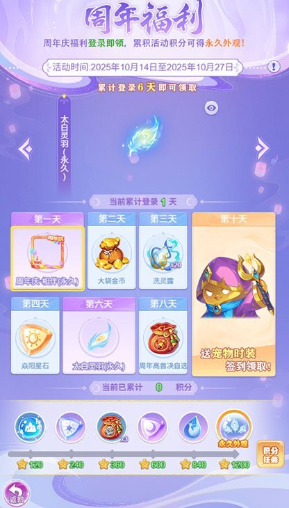 10月14日至10月27日期间,玩家只需累计登录相应天数就能领取奖励,当累计登录天数达到特定要求时,还可获得永久外观道具。在活动进行过程中,每日都会更新积分任务,玩家完成这些积分任务后,可获取萌宠培养道具、任务积分以及贴纸积分。