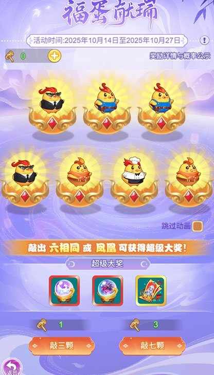 10月14日到10月27日期间,玩家可以使用鸿运金槌打开福蛋。打开福蛋后,会随机出现小鸡或者凤凰,其中小鸡有4种类型,凤凰只有1种。开启福蛋后,奖励的档次将根据出现的相同小鸡的数量来确定;要是出现了凤凰,就一定会得到大奖档次的奖励。