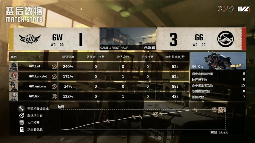 GW的求生者阵营选用了魔术师、“逃脱大师”、飞行家与弓箭手;成都GG的监管者选手Qiu则选定了“跛脚羊”。(禁用先知、古董商、守墓人、大副)