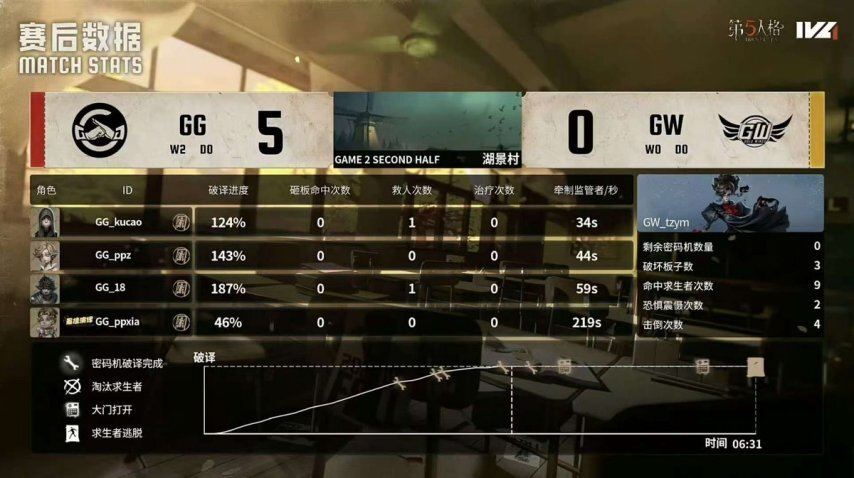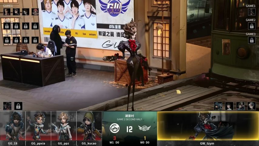 成都GG的求生者阵营确定为飞行家、杂技演员、气象学家与佣兵,禁用角色为“跛脚羊”;GW阵营的监管者选手tzym则选用了歌剧演员,其禁用列表包含先知、古董商、火灾调查员和入殓师。