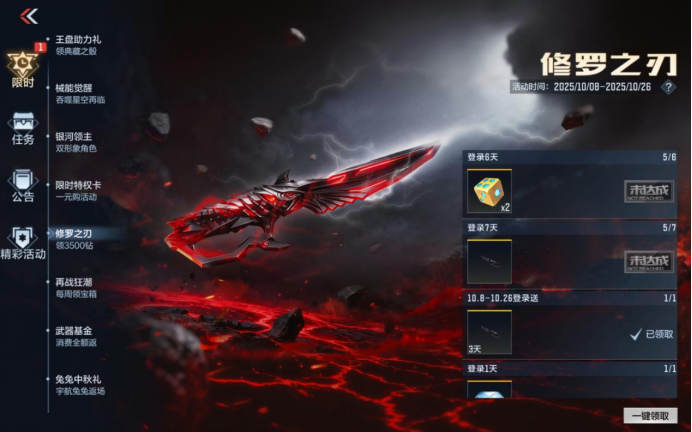英雄级近战武器修罗之刃福利活动现已开启,无需任何门槛即可轻松获取!活动期间,只要累计登录7天,不仅能直接获得这把强力的英雄级近战武器,还能同步领取3500钻石以及2枚典藏之骰——钻石可用于兑换各类道具,典藏之骰则能助力你冲击飞行棋王者之盘。每天上线完成签到,就能将英雄级武器与丰厚奖励道具一并收入囊中,这波超值的近战福利千万别错过!