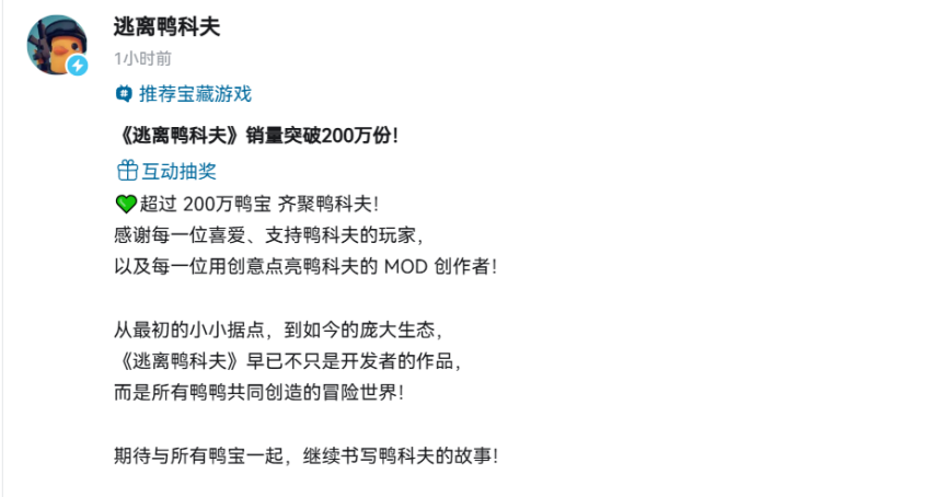 官方发布的贺文公告中提到:超200万鸭宝欢聚于鸭科夫!在此感谢每一位热爱并支持鸭科夫的玩家,以及每一位凭借创意为鸭科夫增添光彩的MOD创作者!从最初的微型据点,到如今的宏大生态,《逃离鸭科夫》早已不再仅仅是开发者的成果,而是所有鸭鸭携手打造的冒险天地!期待和所有鸭宝一同,继续谱写鸭科夫的篇章!