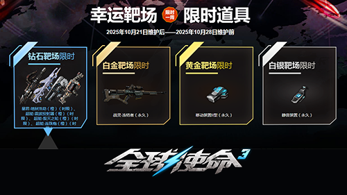 2025年10月21日维护后到28日维护前,幸运靶场会开启限时特供活动。钻石靶场将推出四款橙色时限武器,分别是暴君-地狱浩劫、超能-震波投射器、超能-毁灭之轮、超能-连珠炮,这些武器凭借强大的技能组合和特效表现,将对战场格局产生新的影响。此外,白金靶场、黄金靶场、白银靶场还会分别加入永久战灵-冻结者、移动装置II型和静音装置,构建起从顶级橙色装备到实用装置的完整奖励体系,以此满足不同玩家的装备需求。