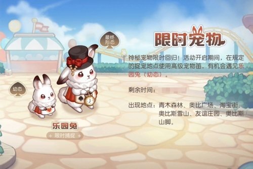 萌宠再度降临,陪伴从未缺席!10月24日5:00至10月30日23:59,限定宠物「乐园兔(幼态)」将现身奥比岛,小奥比们可前往岛内的捉宠区域,使用高级宠物笛即有机会邂逅这只可爱的小家伙哦!