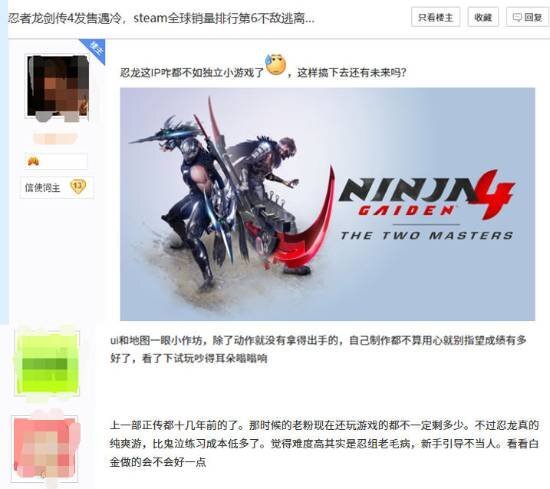 《忍者龙剑传4》热度不温不火的情况同样引发了玩家们的热烈讨论。一种看法是,这类传统硬核动作游戏的入门难度较大,再加上剧情表现没有特别突出之处,所以很难吸引到更多新玩家;而一些系列老粉丝则觉得,这款作品虽然保持了系列一贯的高品质战斗体验,但创新点不够多,因此难以带动更广泛的话题热度。