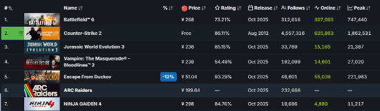 虽然首发加入Xbox Game Pass或许会在一定程度上分散Steam平台的销量,不过当前这款游戏在Steam全球热销榜上仅排第八,落后于《吸血鬼:避世血族2》《逃离塔科夫》《战地6》等新游戏。