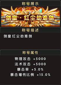 称号属性:物理攻击提升5000点,法术攻击增加5000点,暴击率提高5.0%,暴击增伤比例提升15.0%