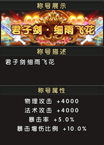 称号属性:物理攻击增加4000点,法术攻击增加4000点,暴击率提升5.0%,暴击增伤比例提高10.0%