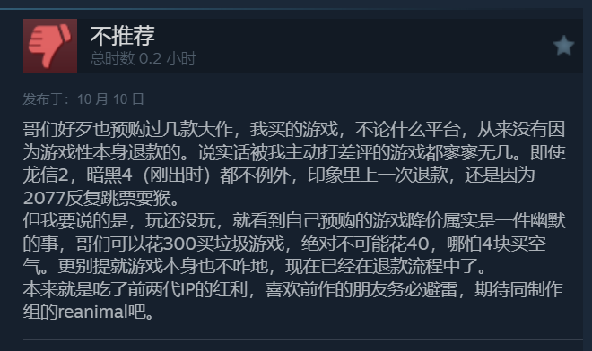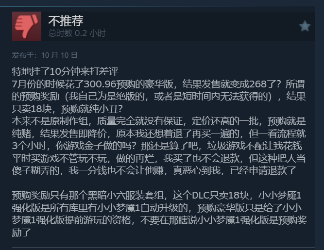 更关键的是游戏刚上线就直接降价了40元,而且当初预购时承诺的额外奖励并非限定性质,现在花18元就能单独购买,这让不少提前预购支持游戏的玩家觉得自己的钱白花了,仿佛买了空气一般,于是纷纷给出了差评。