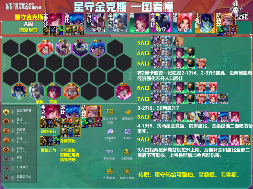 这套阵容的强度竞争已经相当激烈了。开局建议拿奥恩神器里的枯萎宝珠,或者用圣盾转职、天才转职来搭配阵容。海克斯方面,如果遇到同行就选经济类海克斯来追三星;要是没同行,就优先选三个战力型海克斯。