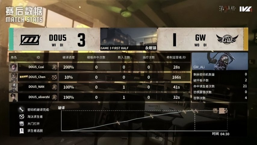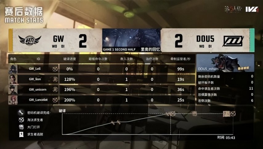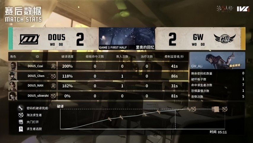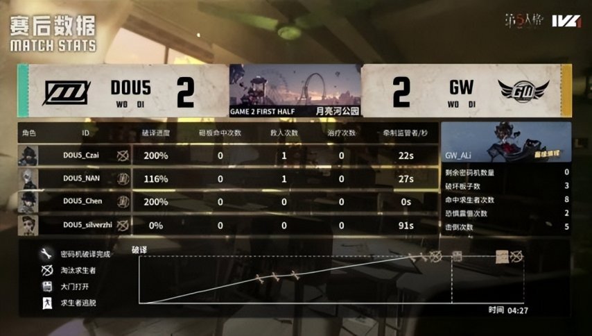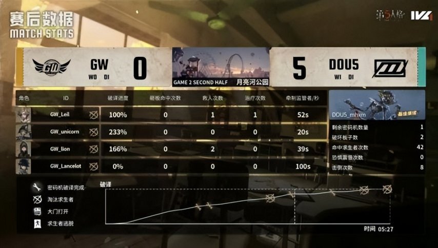 DOU5的求生者阵营选用了幸运儿、小说家、杂技演员与“逃脱大师”,并禁用了邦邦和“跛脚羊”;GW的监管者选手ALi则选择了破轮,同时禁用了先知、古董商、火灾调查员以及弓箭手。