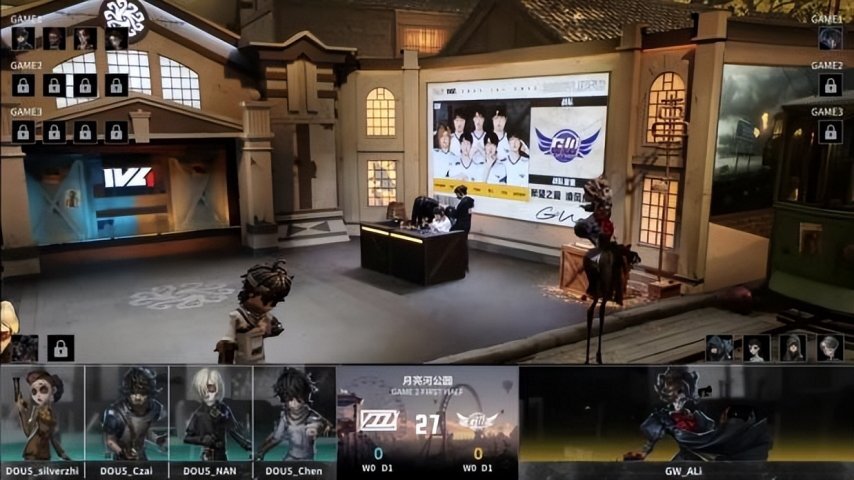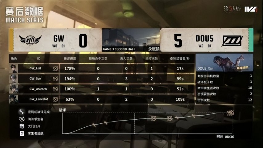 GW的求生者阵营选用了勘探员、入殓师、幸运儿与前锋,禁用角色为时空之影和梦之女巫;DOU5的监管者选手Yan则选定了杂货商,其禁用列表包含先知、拉拉队员、画家以及“逃脱大师”。
