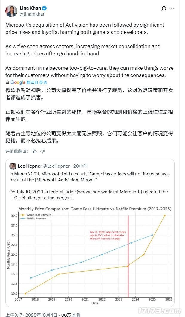作为当年主导FTC起诉微软、试图阻止该并购案的关键人物,卡恩曾警告此交易将削弱竞争、推高价格。尽管法院最终裁定微软胜诉,但她持续发声质疑其商业行为。她引用FTC此前上诉文件中的观点强调:“涨价与产品质量下降,加上裁员削减投入,正是大公司在并购后行使垄断力量的标志。”