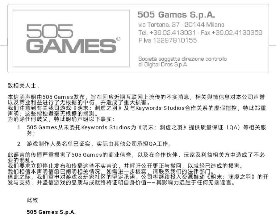 致相关人士: 本函由505 Games发布,旨在针对近期网络上传播的不实信息作出回应。此类舆情内容对我司声誉及商业利益进行了毫无依据的恶意中伤,已造成严重损害。