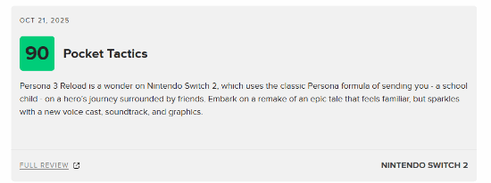 Pocket Tactics 给出90分评价:《女神异闻录3:Reload》在Nintendo Switch 2平台上的表现堪称惊艳,它沿用了《女神异闻录》系列经典的叙事框架——让身为学生的你,在伙伴的陪伴下开启一段英雄征程。作为一部史诗故事的重制作品,它既保留了熟悉的内核,又凭借全新的配音团队、原创配乐与画面呈现,展现出焕然一新的活力。