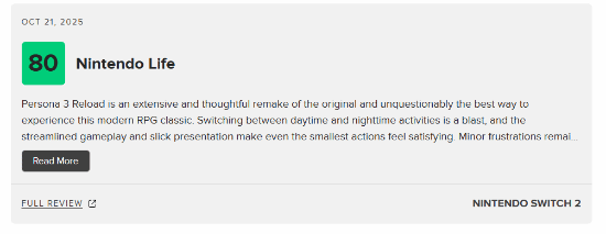 Nintendo Life给出80分评价:《女神异闻录3:Reload》是对原作全面且用心的重制,无疑是体验这部现代RPG经典的最优选择。在白天日常与夜间探索的切换间充满乐趣,简化后的玩法与流畅的画面表现,让哪怕最细微的操作都能带来满足感。一些小瑕疵仍未解决,主要是塔耳塔罗斯(Tartarus)的重复性质,同时缺少FES和Portable版本的内容,使得《Reload》未能成为《女神异闻录3》的终极版本。但如果这些问题对你没有影响,那么它绝对是Switch平台上的必玩之作。