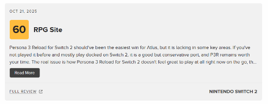 RPG Site 给出60分评价:《女神异闻录3:Reload》的Switch 2版本本应是Atlus最稳操胜券的一次,但它在几个关键方面存在不足。如果你此前没接触过这款游戏,且主要通过Switch 2的底座模式游玩,那么这是一个不错却稍显保守的移植版本,P3R依然值得你投入时间。真正的问题在于,作为Switch 2新移植版核心吸引力的掌机模式体验,如今的表现实在不尽如人意。要是Atlus能把所有DLC都包含进来,那无疑会成为重玩游戏的绝佳理由——既能尝试不同的服装与音乐选项,甚至能让去年玩过基础版的玩家在掌机上体验《埃癸斯篇》(Episode Aigis)。