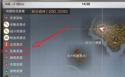 2、抵达秋日森林后,再次轻点小地图。点击小地图左侧的石类资源,具体位置如图所示。