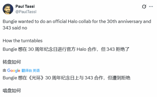 Paul Tassi 透露,《命运 2》开发商 Bungie(同时也是《光环》系列的创始团队)在筹备30周年纪念活动时,原本计划开展一次官方联动,不过这一想法遭到了当时负责《光环》的343工作室的拒绝。