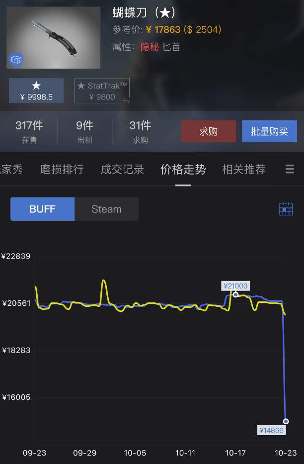 更新之后没过多久,第三方交易平台上的匕首、手套类饰品价格就立刻出现了大幅下跌,很多饰品的价格甚至直接减半,比如原版「蝴蝶刀」就从将近2万元降到了1万元上下。