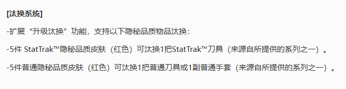 这次V社对游戏内的“升级汰换”(汰换合同)功能进行了拓展,现在可以使用5个隐秘品质(红色)的物品,汰换获得匕首或手套这类金色品质的物品。具体的更新内容如下: