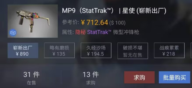 不过,另一边的情况却截然不同——那些性价比高的红色品质饰品价格都出现了大幅上涨。比如「MP9-星使」,原本只卖几十元,现在已经飙升到一百多元,其中“崭新暗金”版本的价格甚至有突破千元的势头。