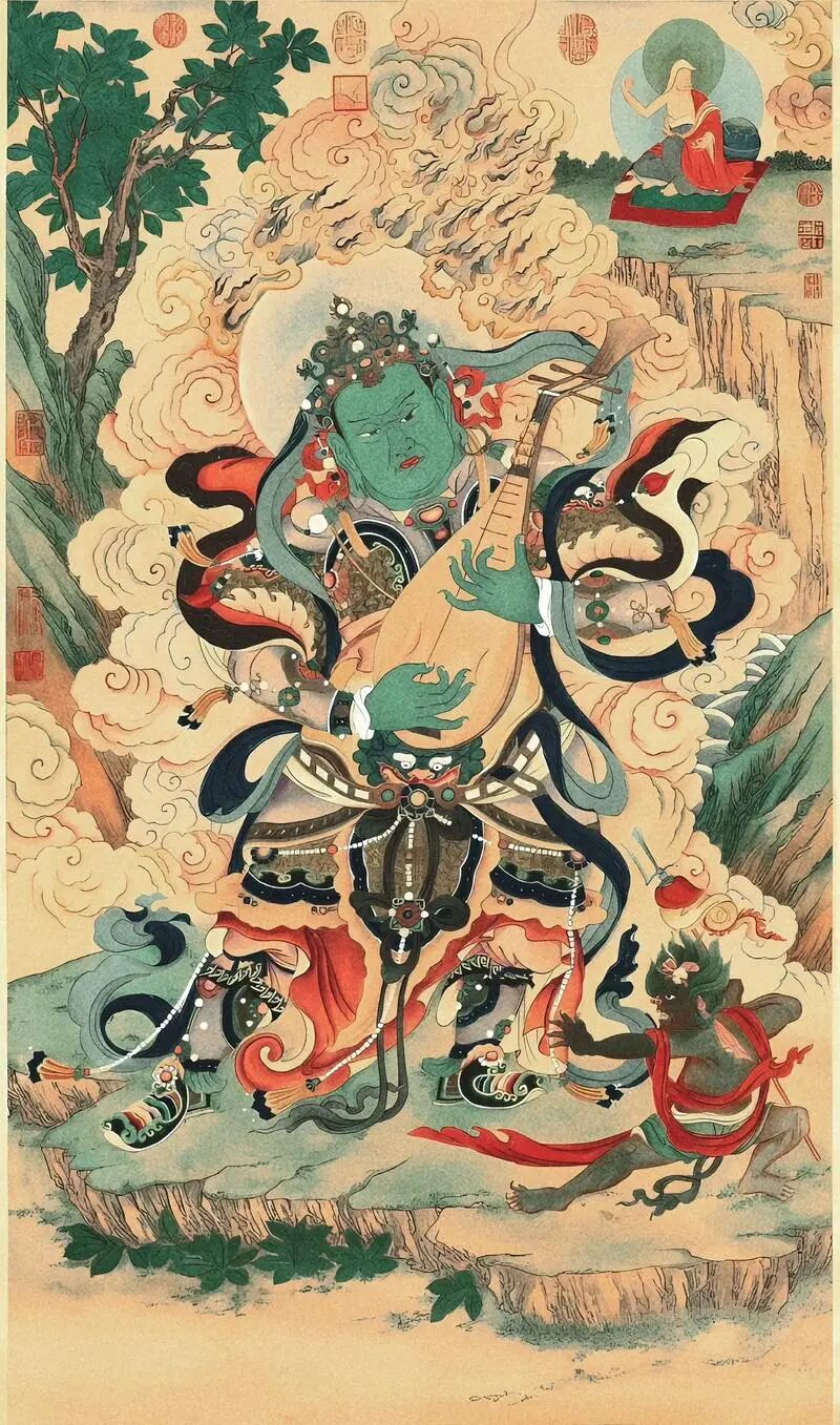 佛教四大天王里,东方持国天王的身形呈白色,手中持有琵琶,人们尊称他为“乐神”,琵琶奏响的乐声能够带来安宁与快乐。