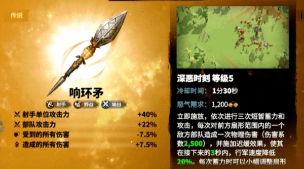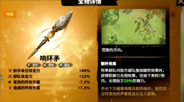 装备后,能使玩家角色射手的攻击力提升百分之四十,同时提高部队攻击力。