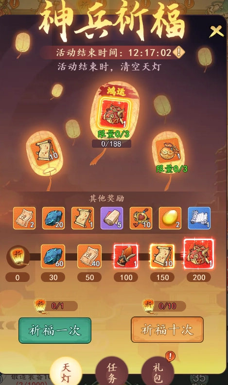 3、当祈福达到一定次数,即可获得鸿运大礼。每期的鸿运大礼数量有限,限量次数每期重置。