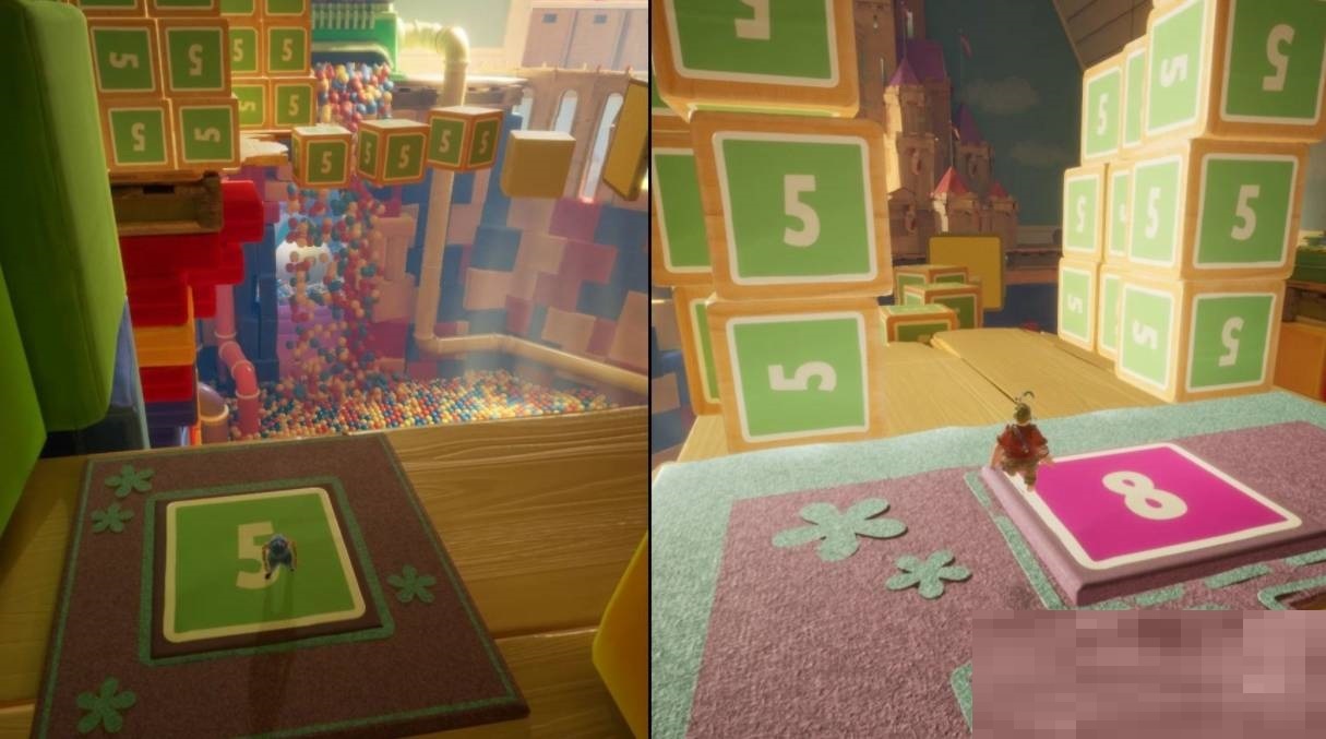 6继续往前走会看到一个小猪存钱罐,接着把周围的四枚硬币都放进去,小猪就会倒下,之后跳起来踩它就能踩碎存钱罐,解锁成就。小猪存钱罐旁边有个小游戏,两人比拼谁击中球的次数更多,次数多的一方获胜。再往前拿到指尖陀螺就能飞行了,首先要把下一个区域里红黄蓝三个管子的阀门关闭才能通过。借助指尖陀螺一直向前走,就会触发剧情。