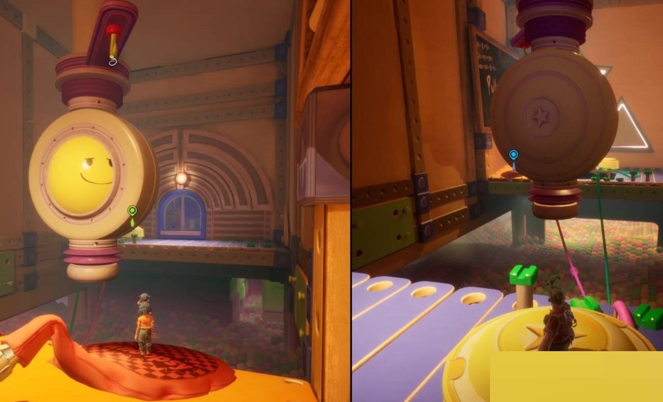 5. 下一个场景中,先把两个平台拉开距离,再借助反墙跳抵达上层,两人同时拉开上方的开关就能通关。随后进入打气球的区域,第一步让玩家A站在绿色管子相连的气球上,玩家B踩踏充气装置把玩家A弹起,A要趁机用绳索抓住上方的手指。接着玩家B站到另一个气球上,玩家A从高处踩下另一个充气装置,B起跳抓住前方的绳索钩点。B到达对面后,分别击打绿色气管让A抓住手指,A立刻跳到另一个气球上,B再踩另一个充气装置,A就能起跳勾住目标了。离开这里后,在下方区域找到绿色和黄色管道的阀门,转动阀门就能穿过去了。