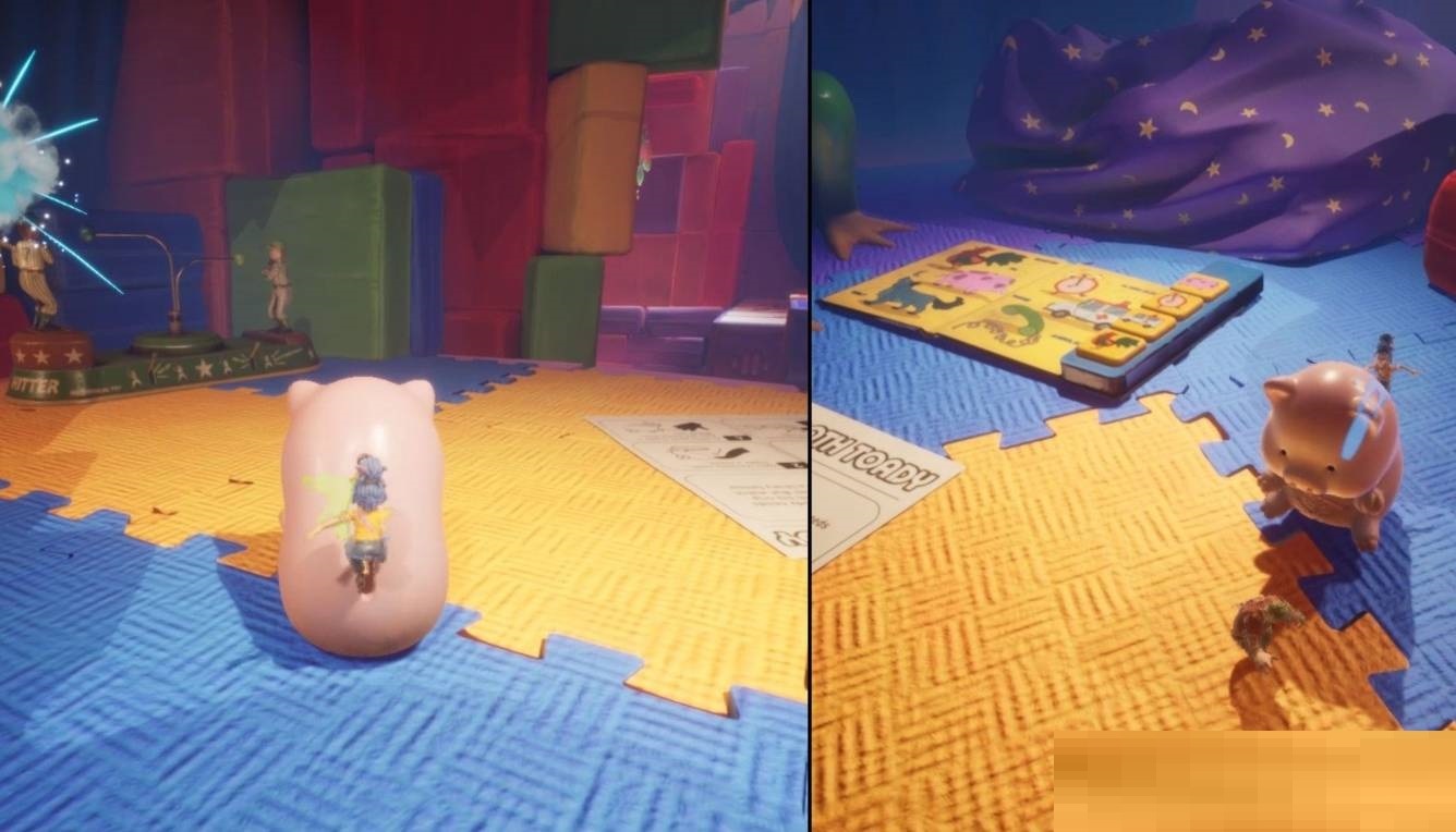 1. 进入游戏后,从床底穿过到达图示位置,直接把小车拉到指定位置,小车会飞出去穿过圆圈,这样就能解锁成就。小车旁边有个垫子,垫子上有个小游戏,参与双方要按照提示按键,判断正确且操作越靠近中心区域,得分就越高。