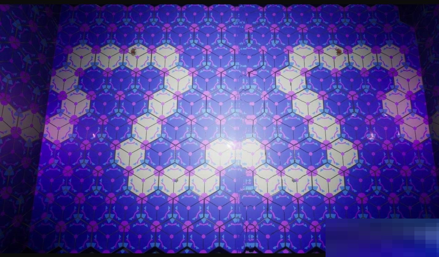 7. 接下来很容易感到眩晕,所以得快速通过。到达下图所示的位置后,两人分别站在图中的对应位置,就能开启后续的通路。之后只需连接脚下的白色方块就行,镜像区域的站位和下图一致。