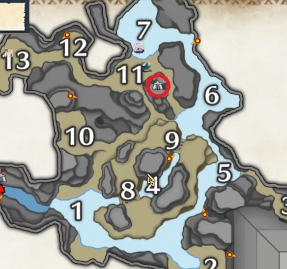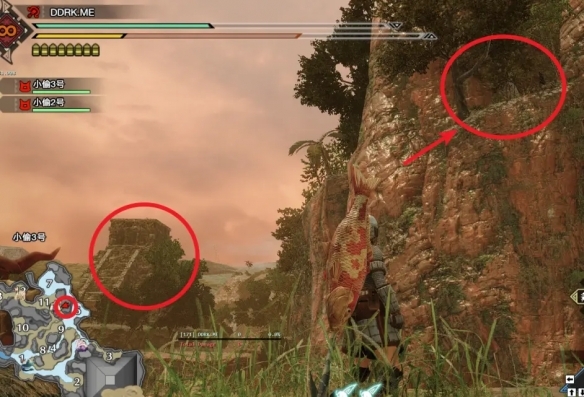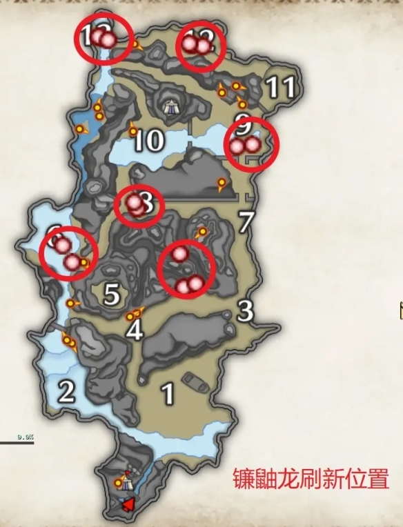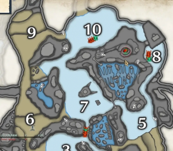 水没林的营地不太容易找到,这里提供了三张参考图,你可以自行比对来确定位置。毒狗龙的刷新区域为:水没林的9区、10区和11区。