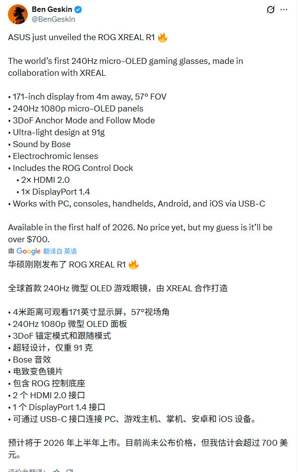 根据华硕的说法,ROG Xreal R1预计将在2026年上半年发售,但目前尚未公布具体售价。作为参考,上一代AirVision M1眼镜的首发价格为699美元。