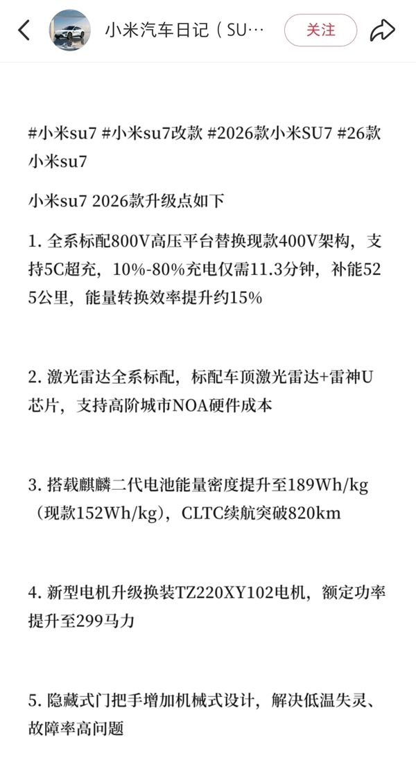 值得一提的是,去年11月,知名汽车博主“韩路”曾透露一则“独家小道消息”,称小米SU7的换代车型预计于2026年第二季度上市,届时会有不少升级,但价格将上涨2万元。