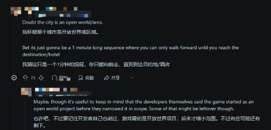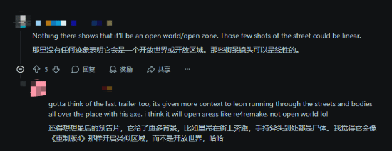 其他玩家在评论里回应说不太可能,这一作更可能是打造一个稍大些的开放环境,比如某个段落能让你持续往前走一分钟;也有玩家表示,卡普空的这款引擎不太适合做开放类型的游戏,但特别适合这类场景搭建,呈现效果相当好。
