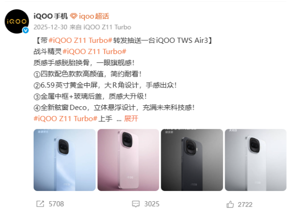 【手机频道】今天早些时候,iQOO通过官方微博正式宣布,定位“战斗精灵”的iQOO Z11 Turbo将于1月15日晚7点举行发布会,并且在发布的同时开启销售。这款机型作为主打“外观亮眼,性能强悍”的中端性能旗舰产品,搭载了行业内少见的6.59英寸中等尺寸屏幕、双芯片以及2亿像素主摄的组合配置,整体产品竞争力十分突出。