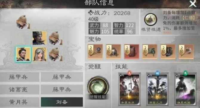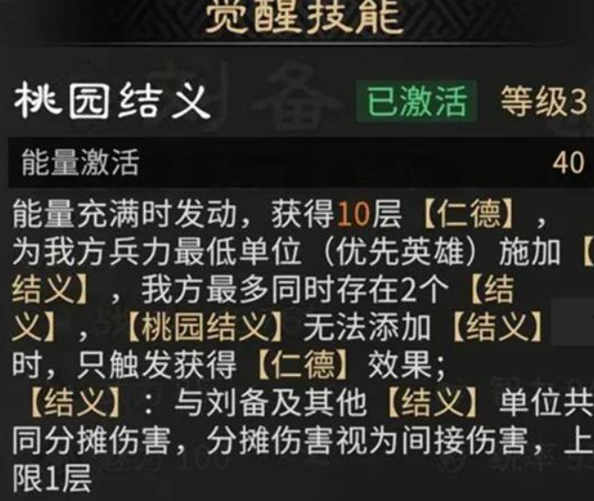 当刘备达成觉醒状态后,会解锁强力主动技能桃园结义。施展此技能能立刻积累大量仁德层数,同时为当前兵力最少的友方武将赋予“结义”效果。处于结义状态的两个单位将共同承担所有受到的伤害,这等同于为团队提供了出色的单体减伤能力,可有效保障核心输出或主将的存活。