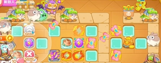 1. 在《保卫萝卜4》“法老归来”第57关开始时,于地图中间位置建造两个燃烧瓶炮台以及两个蝴蝶结炮台,以此来清除下方的道具。