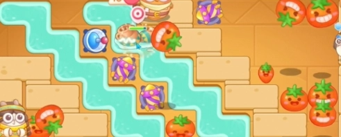 1. 在《保卫萝卜4法老归来》的第64关开始时,于游戏场景中间位置建造一个烟花和一个番茄,接着利用番茄去清理右侧的道具。
