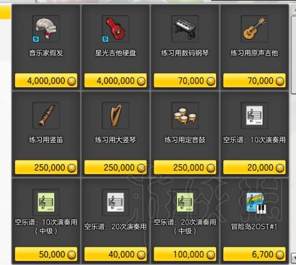 然后就是这些可能是二手又贵的1B的商品,我们要用到的就是2W金币的白谱子和5W金币的绿谱子,如果你一个曲子放20遍不腻的话。