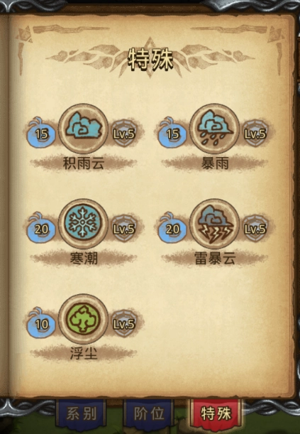 暴雨(15mp),每间隔10轮,使全体敌人的沙漏时间增加1轮。