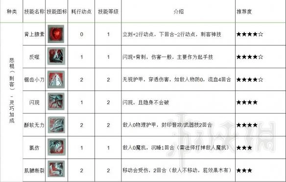 刺客自带的种族技能“肉身献祭”堪称神技,它无需消耗资源,消耗6点体力,能增加1点行动点和10%伤害,由于是初始自带的技能,这里就不再单独列出了。