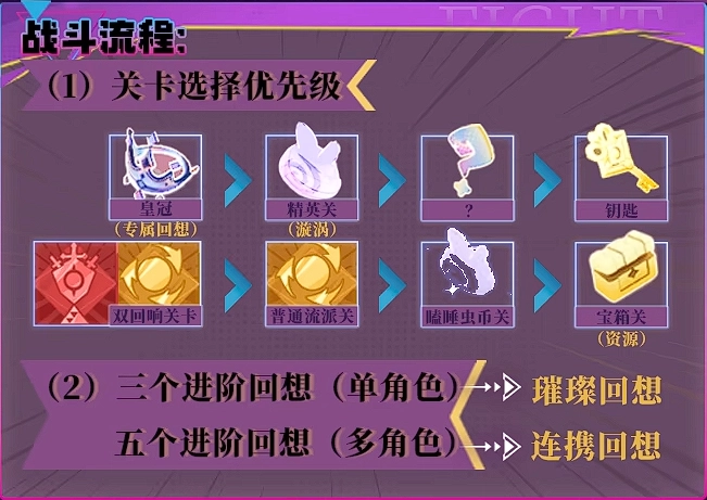 局内刷图关卡的选择顺序为:皇冠>精英关>?>钥匙>幸运的暗面>普通流派关>瞌睡虫币关>宝箱关(资源) 。除了boss前的商店外,其他商店是否进入,取决于你所拥有瞌睡虫币的数量。