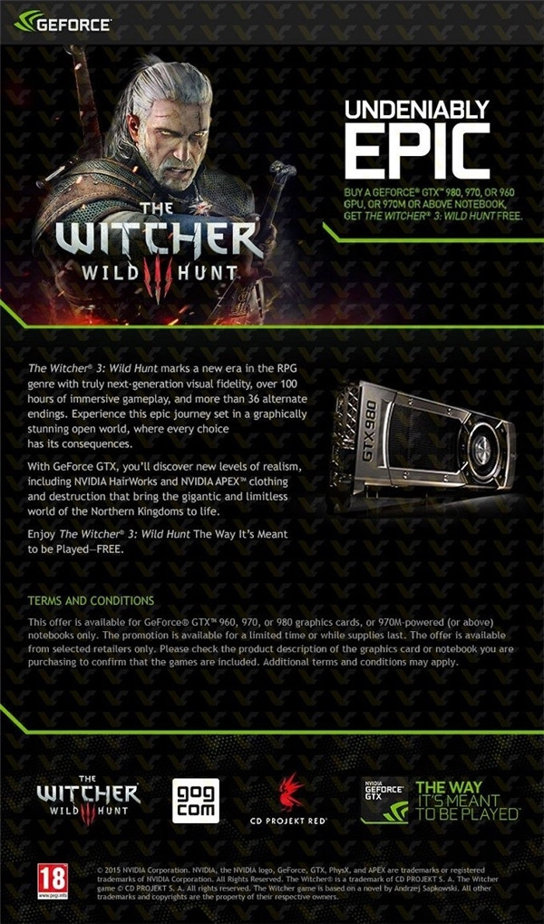今年3月初,我们留意到一张相似的海报(见本文末尾),内容显示:购买GeForce GTX980、GTX970、GTX960系列显卡,或是搭载970m及更高规格显卡芯片的笔记本电脑,即可免费获赠《巫师3:狂猎》游戏。该活动由部分经销商限时推出,礼品数量有限,赠完即止。