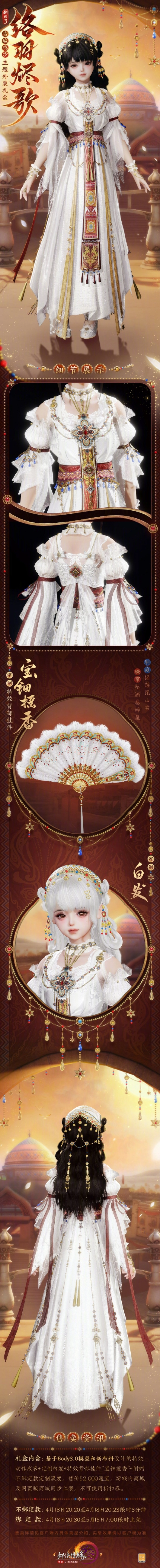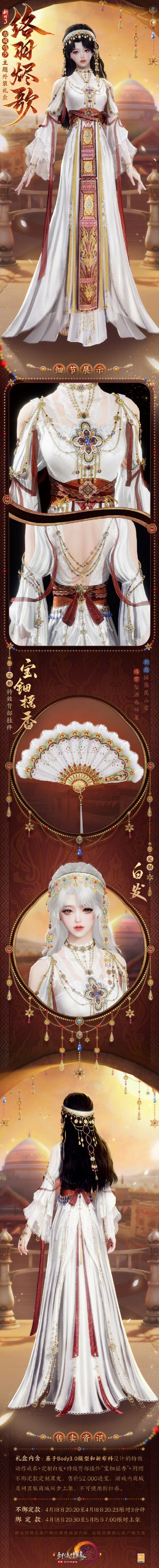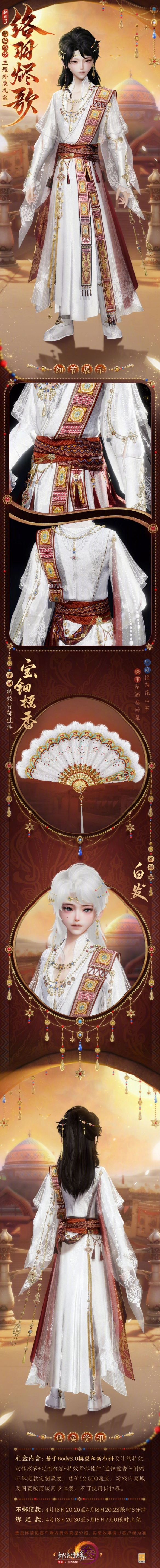 络羽烬歌是《剑网3》古城鸣沙主题时装。这套时装是什么样子的呢?时装整体以白色为主色调,红色作为辅助色,再搭配少量金色点缀。而且,时装礼盒还包含定制白发以及特效背部挂件宝钿摇香。接下来,就由小编为大家详细呈现《剑网3》古城鸣沙主题外装络羽烬歌的外观一览!