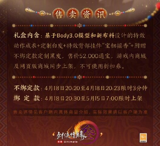 2、该礼盒售价为52.000通宝,将在游戏内商城以及网页商城同步上线,此商品不支持使用折扣券。
